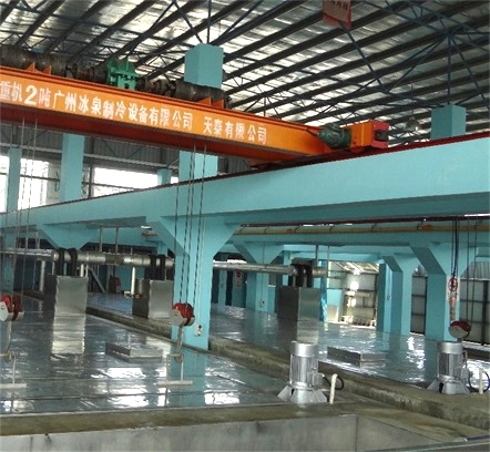 制冰池注滿鹽水,鹽水溫度被蒸發(fā)器冷卻。冰模內(nèi)加適量的水后放入制冰池內(nèi),利用低溫鹽水使桶內(nèi)水凍結(jié)成冰。出冰時,m個冰模固定成一排,共排列n排,使用鋼架固定,為了加快冰的凍結(jié)速度,用攪拌器使鹽水均勻的在冰模間循環(huán),待冰桶內(nèi)水凍結(jié)成冰后,用行車裝置將冰桶架吊送到融冰池,在池中浸2-3分鐘,使冰桶內(nèi)冰的表面融化,再把冰桶放在倒冰架上,冰塊就很容易脫離冰桶傾倒在帶有坡度的滑冰道上,使冰塊滑到送冰車中。然后把冰桶注水后放入鹽水池中繼續(xù)循環(huán)制冰。