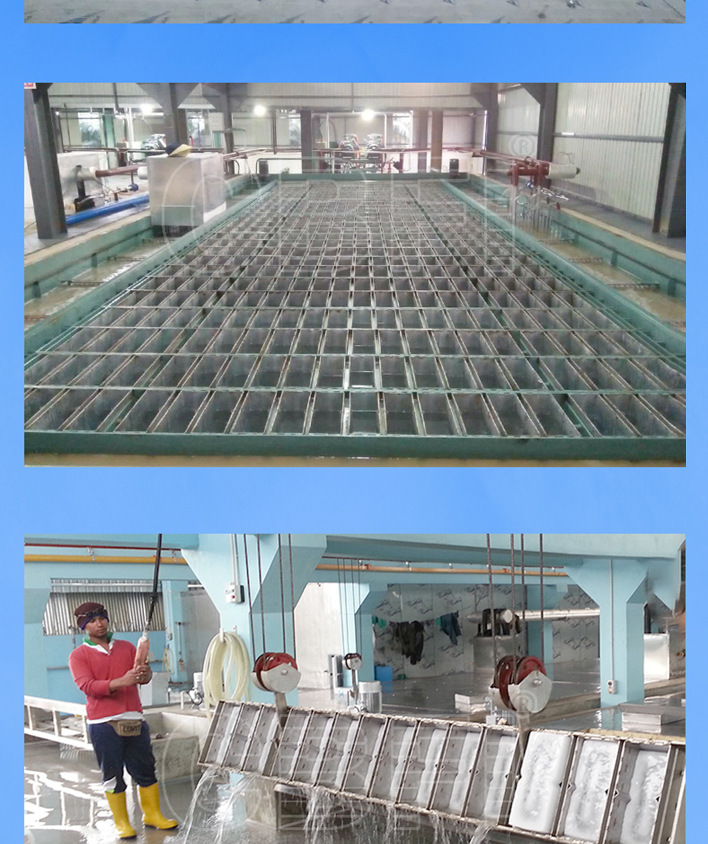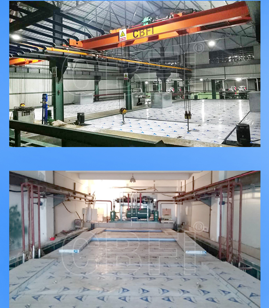 大型土建鹽水冰磚機即大噸位冰磚機,采用磚石混凝土建筑鹽水池,通常配套大型行車系統(tǒng)。該種類型的鹽水冰磚機多見于區(qū)域性大型冰磚制造廠。例如馬來西亞--100噸大型冰磚制冰廠項目 和 馬來西亞--60噸大型冰磚制冰廠項目 。