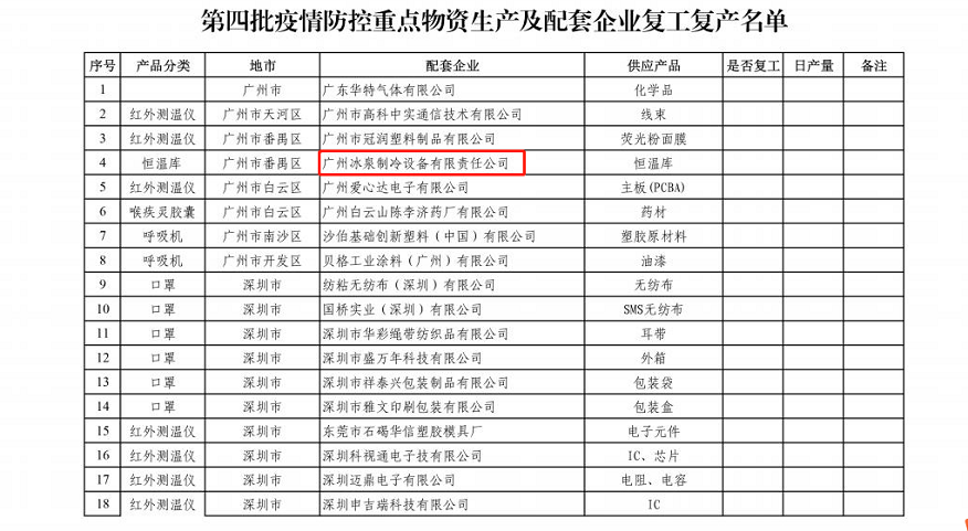 為保障疫情防控重點(diǎn)物質(zhì)生產(chǎn)供應(yīng),廣州冰泉制冷設(shè)備有限責(zé)任公司作為恒溫庫供應(yīng)企業(yè),響應(yīng)政府號(hào)召,作為政府第四批疫情防控重點(diǎn)物質(zhì)生產(chǎn)及配套企業(yè)。